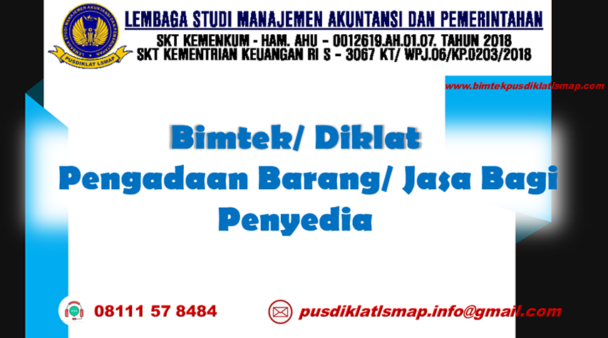 Sehubungan dengan hal di atas dalam rangka Peningkatan Kapasitas dan Kapabilitas guna mendukung kebijakan serta regulasi baru Pemerintah Pusat. Maka kami Lembaga Studi Manajemen Akuntansi dan Pemerintahan mengajak Bapak/Ibu/Saudara(i) Aparatur di Lingkungan Pemerintahan Provinsi, Kabupaten dan Kota untuk mengikuti Bimbingan Teknis dengan Tema: Peningkatan Kapasitas Bagi Penyedia Pengadaan Barang/ Jasa.