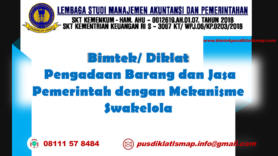 Sehubungan dengan hal di atas dalam rangka Peningkatan Kapasitas dan Kapabilitas guna mendukung kebijakan serta regulasi baru Pemerintah Pusat. Maka kami Lembaga Studi Manajemen Akuntansi dan Pemerintahan mengajak Bapak/Ibu/Saudara(i) Aparatur di Lingkungan Pemerintahan Provinsi, kabupaten dan Kota untuk mengikuti Bimbingan Teknis dengan Tema: Bimtek Pengadaan Barang dan Jasa Pemerintah dengan Mekanisme Swakelola.