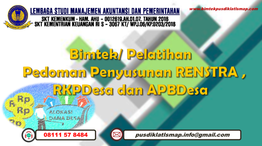 Sehubungan dengan hal di atas dalam rangka Peningkatan Kapasitas dan Kapabilitas guna mendukung kebijakan serta regulasi baru Pemerintah Pusat. Maka kami Lembaga Studi Manajemen Akuntansi dan Pemerintahan mengajak Bapak/Ibu/Saudara(i) Aparatur di Lingkungan Pemerintahan Desa untuk mengikuti Bimbingan Teknis dengan Tema: Bimtek Pedoman Penyusunan Renstra, RKP Desa dan APBDesa.