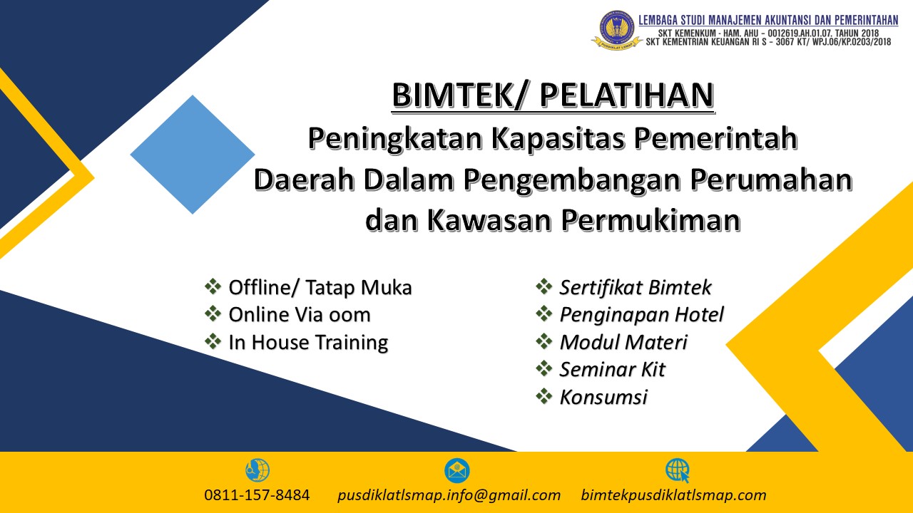 Sehubungan dengan hal di atas dalam rangka memahami serta meningkatan Kapasitas dan Kapabilitas. Maka kami Lembaga Studi Manajemen Akuntansi dan Pemerintahan mengajak Bapak/Ibu/Saudara (i) untuk mengikuti Bimbingan Teknis dengan Tema : Peningkatan Kapasitas Pemerintah Daerah Dalam Pengembangan Perumahan dan Kawasan Permukiman.