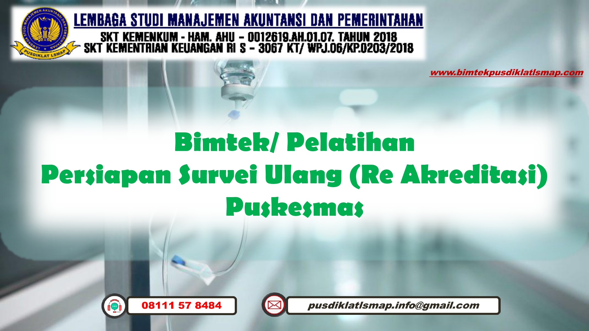 Sehubungan dengan hal di atas dalam rangka memahami serta meningkatan Kapasitas dan Kapabilitas guna mendukung kebijakan serta regulasi baru Pemerintah Pusat. Maka kami Lembaga Studi Manajemen Akuntansi dan Pemerintahan mengajak Bapak/Ibu/Saudara(i) untuk mengikuti Bimbingan Teknis dengan Tema: Persiapan Survei Ulang (Re Akreditasi) Puskesmas.
