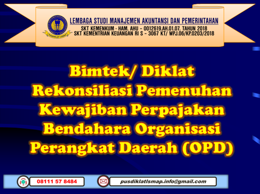 Sehubungan dengan hal di atas dalam rangka Peningkatan Kapasitas dan Kapabilitas guna mendukung kebijakan serta regulasi baru Pemerintah Pusat. Maka kami Lembaga Studi Manajemen Akuntansi dan Pemerintahan mengajak Bapak/Ibu/Saudara(i) Aparatur di Lingkungan Pemerintahan Provinsi, Kabupaten dan Kota untuk mengikuti Bimbingan Teknis dengan Tema: Bimtek Rekonsiliasi Pemenuhan Kewajiban Perpajakan Bendahara Organisasi Perangkat Daerah (OPD).