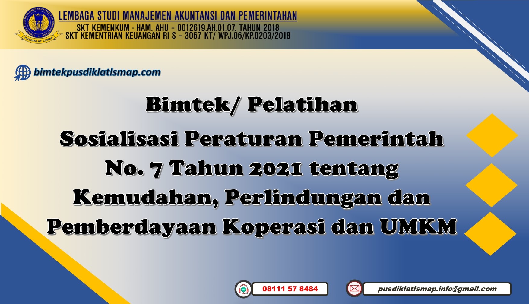 Sehubungan dengan hal di atas dalam rangka memahami serta meningkatan Kapasitas dan Kapabilitas guna mendukung kebijakan serta regulasi baru Pemerintah Pusat. Maka kami Lembaga Studi Manajemen Akuntansi dan Pemerintahan mengajak Bapak/Ibu/Saudara(i) untuk mengikuti Bimbingan Teknis dengan Tema: Sosialisasi PP No. 7 Tahun 2021 tentang Kemudahan, Perlindungan, dan Pemberdayaan Koperasi dan UMKM.