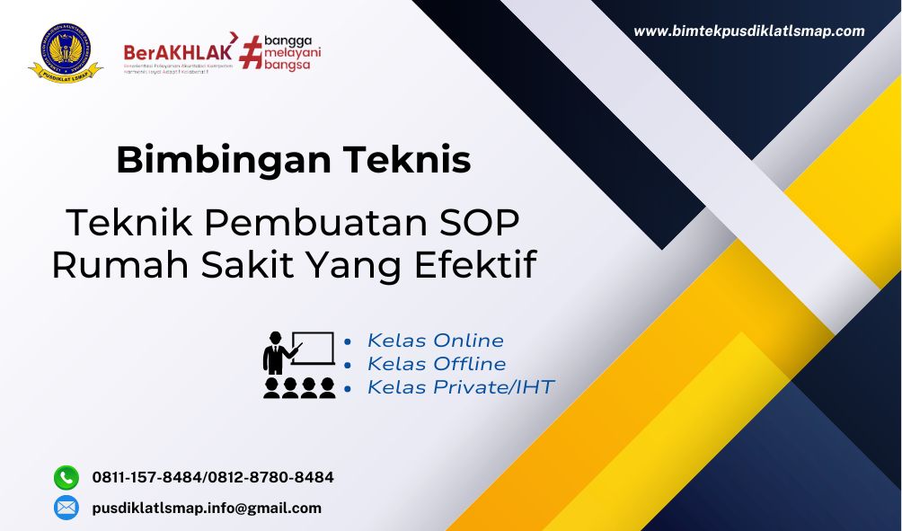 Bimtek Teknik Pembuatan SOP Rumah Sakit – SOP adalah suatu perangkat instruksi atau langkah-langkah yang dibakukan untuk menyelesaiakan proses kerja rutin tertentu. Dimana keberadaan SOP di Rumah Sakit sangat membantu aktifitas kerja seluruh pihak di Rumah Sakit dalam melakukan aktifitas sesuai standar yang telah ditetapkan. Oleh karenanya, kemampuan dalam membuat SOP Rumah Sakit sangat dibutuhkan oleh para penanggungjawab manajemen guna mengselaraskan aktifitas kerja seluruh pihak dirumah sakit.baik antar pribadi maupun rekan kerja di Rumah Sakit.
